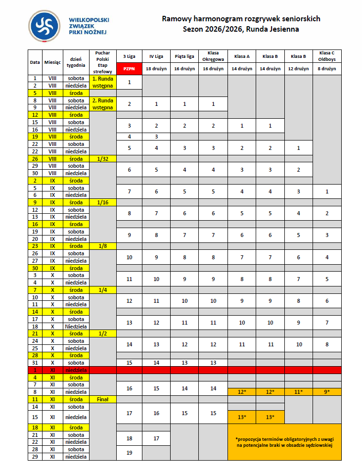 Ramowy harmonogram rozgrywek seniorskich na sezon 2026/27 - runda jesienna